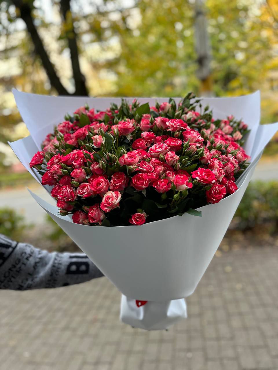 Изящный комплимент из веток кустовой розы оформленный в дизайнерскую упаковку. Такой букет подойдёт на любой случай, будь то первое свидание или годовщина свадьбы. Нежный и насыщенный цвет подчеркнет нежность, а яркий цвет искренность чувств.