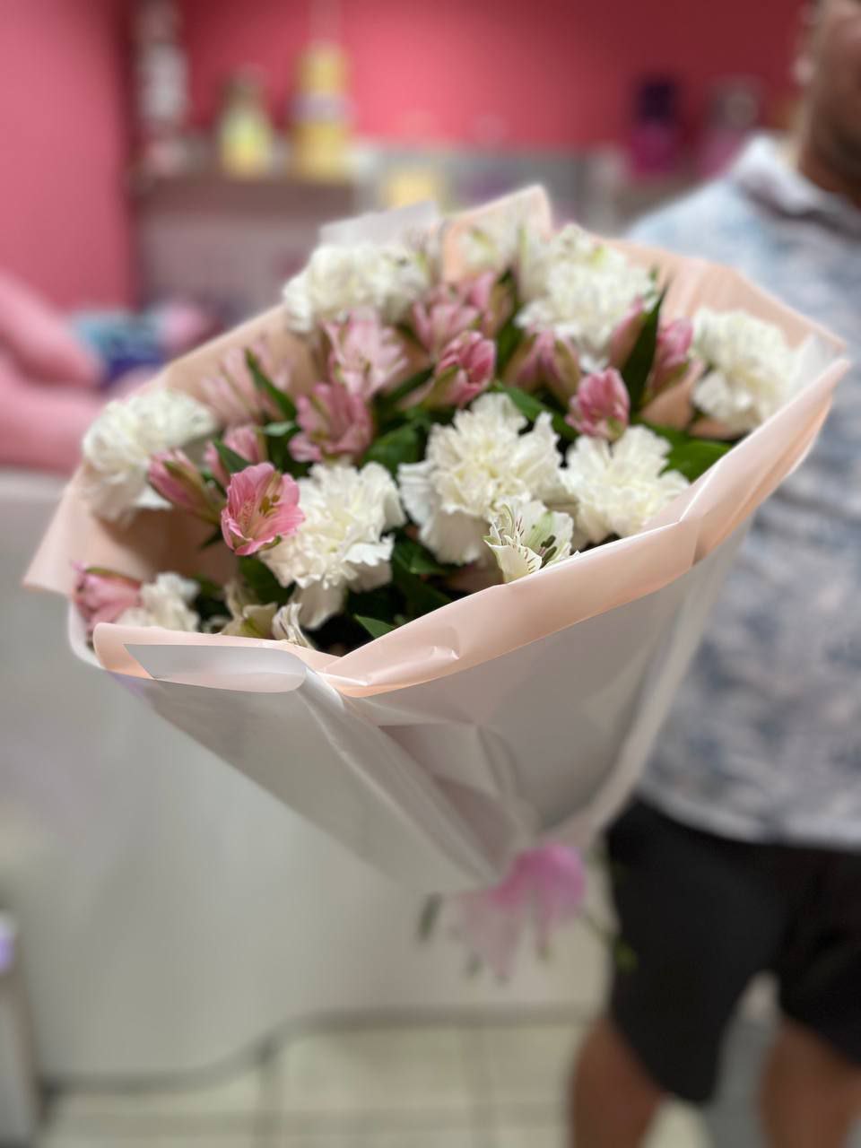 Состав: 7 диантус, 7 альстромерия,упаковка, атласная лента.