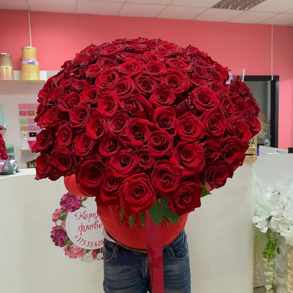 Состав: 101 роза высота 50см,лента атласная Так как мы работаем только со свежими цветами, отдельные цветы ввиду наличия или сезонности могут быть заменены на аналогичные не меньшей стоимости в рамках цветовой гаммы и настроения. Но определенно, ваш букет будет самым особенным!