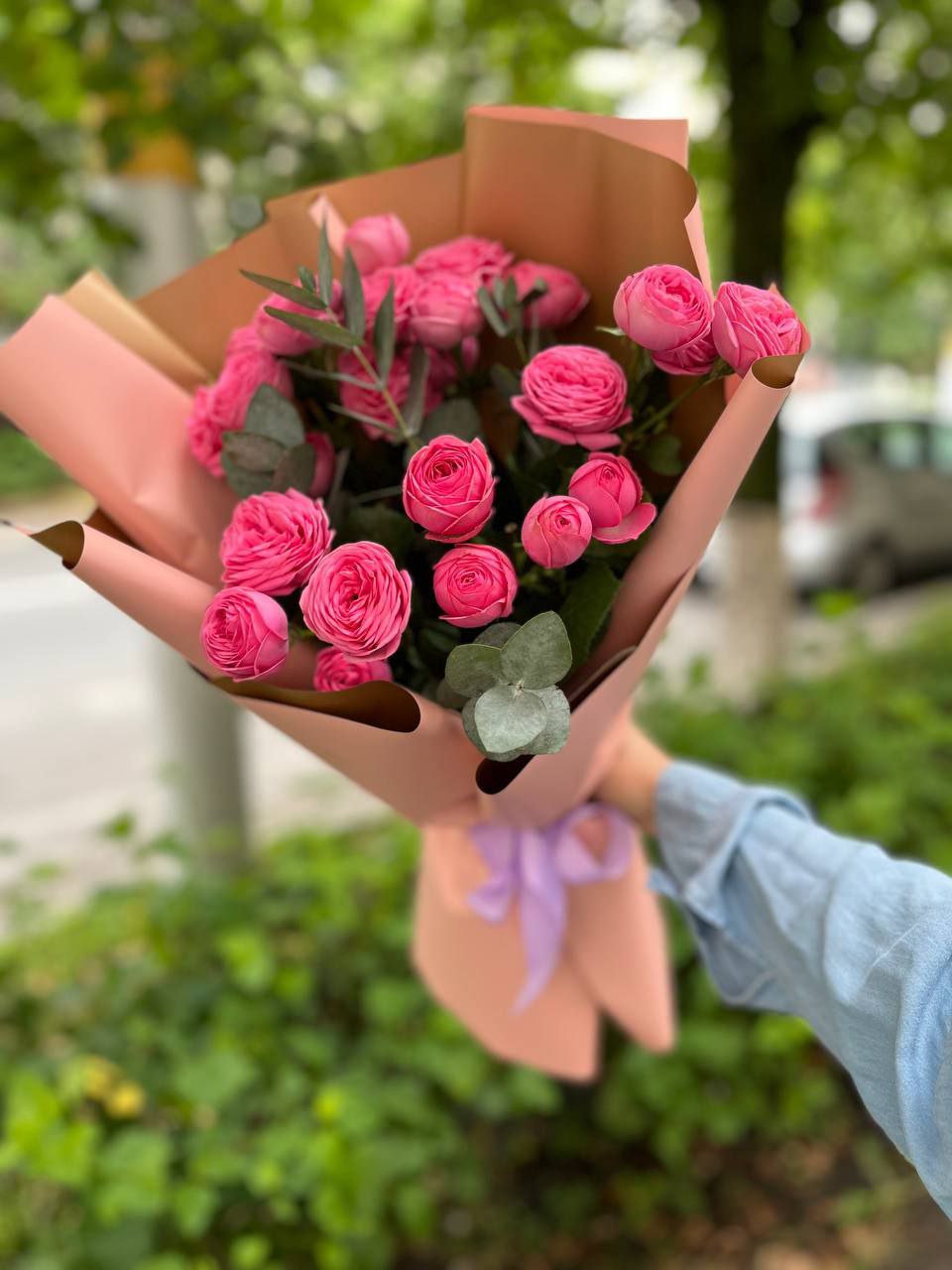 Состав: 5 кустовых пионовидных роз сорта Giselle,ароматные веточки эвкалипта, упаковка, атласная лента.