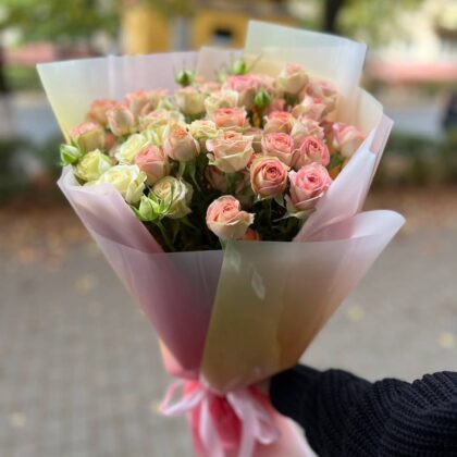 Состав: 5 кустовых пионовидных роз сорта Giselle,ароматные веточки эвкалипта, упаковка, атласная лента.