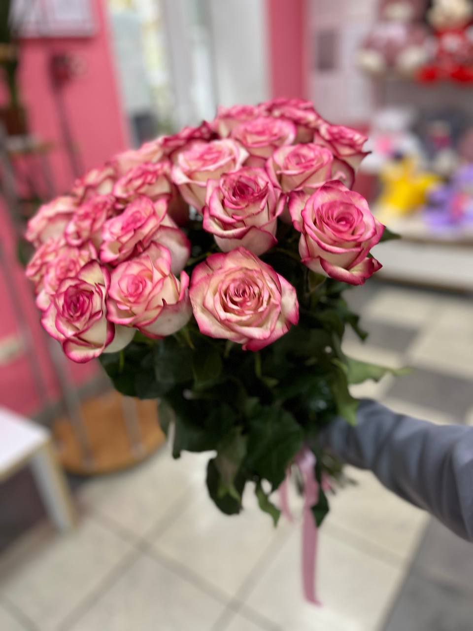 Букет из 21 розовой розы “Дилена” с лентой