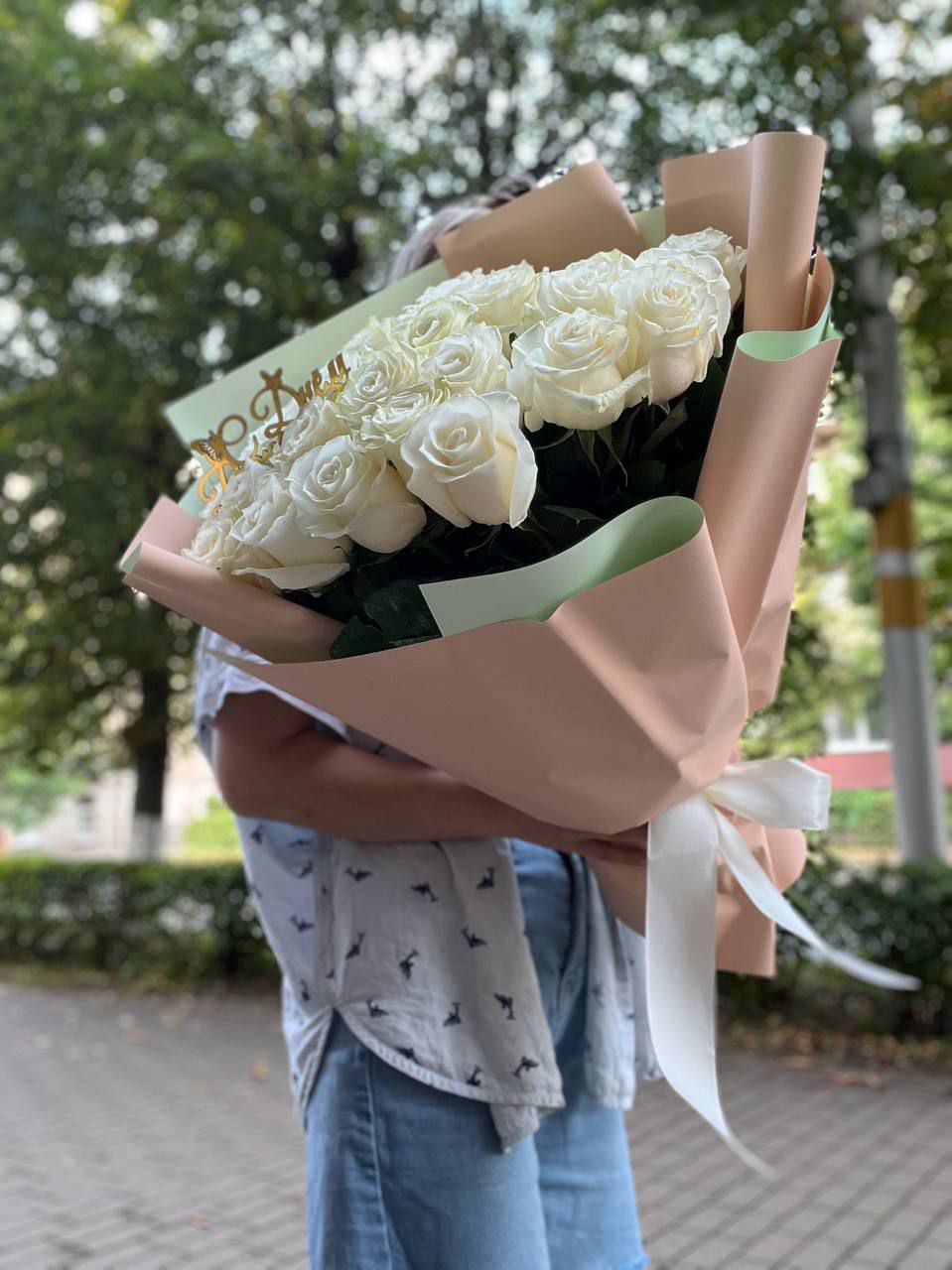 Букет из белоснежных роз, которые идеально сочетают в себе изысканность и чистоту чувств. Этот букет станет альтернативным подарком для самых разных поводов: от романтического свидания до юбилея или свадебного торжества. Белые розы символизируют искренность, уважение и восхищение, поэтому они подходят самым близким и дорогим людям.