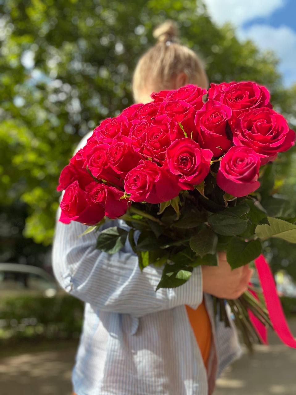 Букет из 31 малиновой розы “Восторг” с лентой