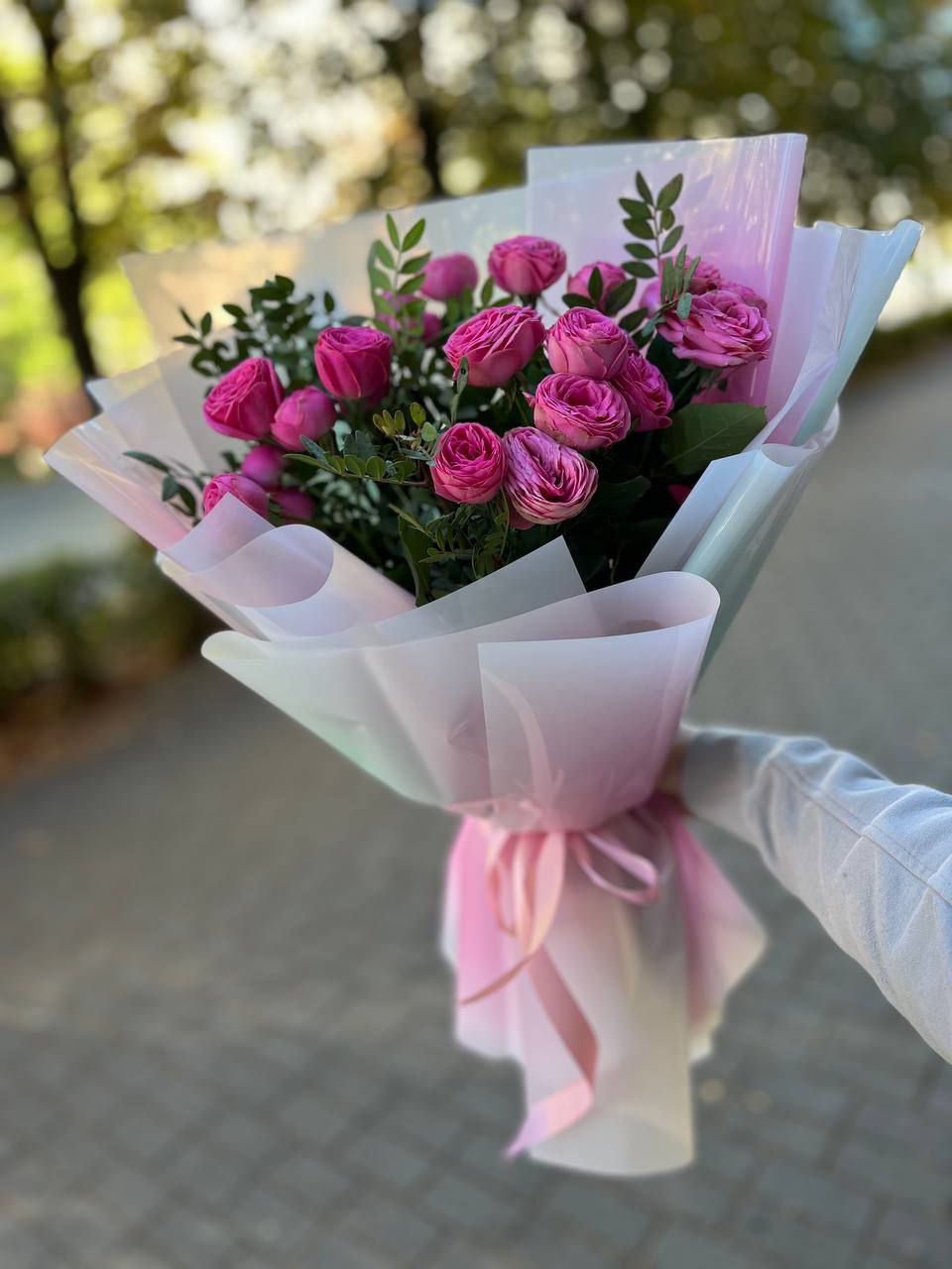 Состав: 5 кустовых пионовидных роз сорта Giselle,ароматные веточки эвкалипта, упаковка, атласная лента.