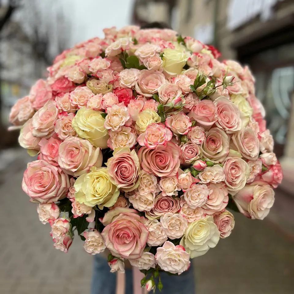 Состав: 41 ветка кустовой розы, 50 роз, лента атласная Так как мы работаем только со свежими цветами, отдельные цветы ввиду наличия или сезонности могут быть заменены на аналогичные не меньшей стоимости в рамках цветовой гаммы и настроения. Но определенно, ваш букет будет самым особенным!