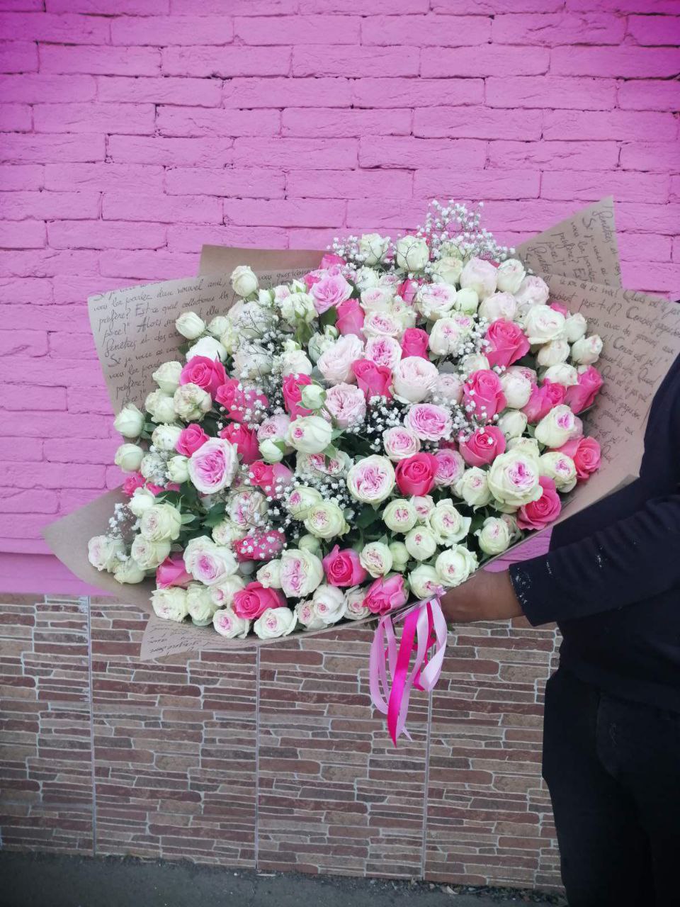 Состав: 31 кустовая пионовидная роза, 37 одноголовых роз, гипсофил 5т,упаковка,лента атласная Так как мы работаем только со свежими цветами, отдельные цветы ввиду наличия или сезонности могут быть заменены на аналогичные не меньшей стоимости в рамках цветовой гаммы и настроения. Но определенно, ваш букет будет самым особенным!