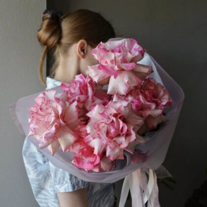 Прекрасный букет из французских роз. Эти розы завоевали сердца многих клиентов. Такую розу любят за её нестандартный вид и грацию. И даже букет всего из пяти штук выглядит очень впечатляюще.