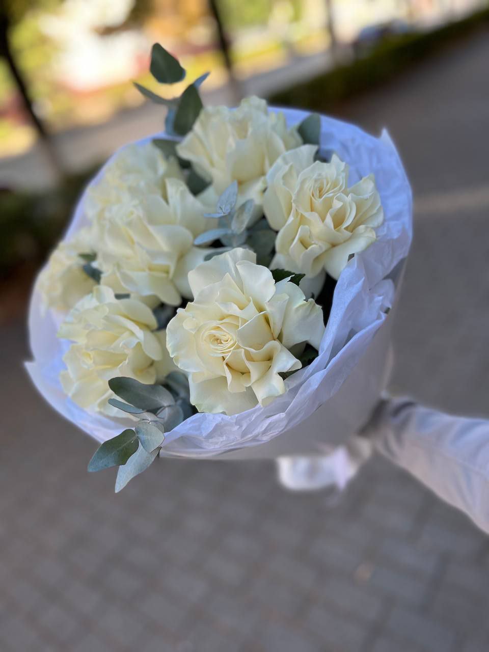 Состав:7 французских роз,2 эвкалипта, упаковка, атласная лента.