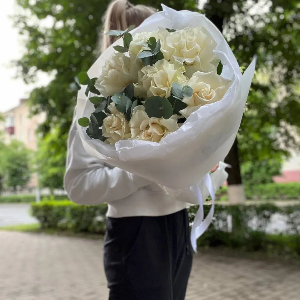 Состав: 7 французских роз,2 эвкалипта, упаковка, атласная лента.