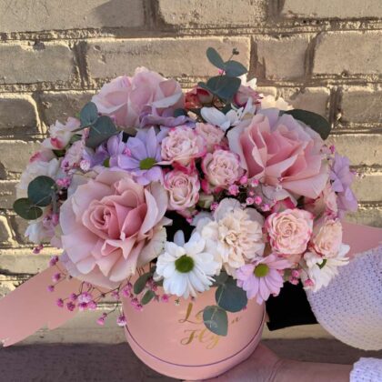 Цветочная композиция в коробке – это вариант подарка для тех, кто привык не только к красоте и благоуханию цветов, но и к удобству. Ей не требуется ваза – внутри сумки находится специальная губка, пропитанная водой, в которую вставлены цветы.