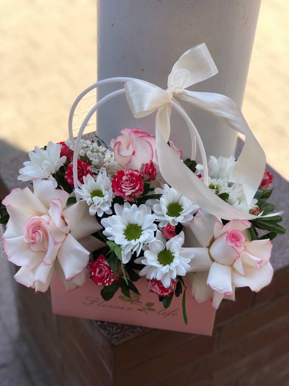 Цветочная композиция в коробке – это вариант подарка для тех, кто привык не только к красоте и благоуханию цветов, но и к удобству. Ей не требуется ваза – внутри сумки находится специальная губка, пропитанная водой, в которую вставлены цветы.