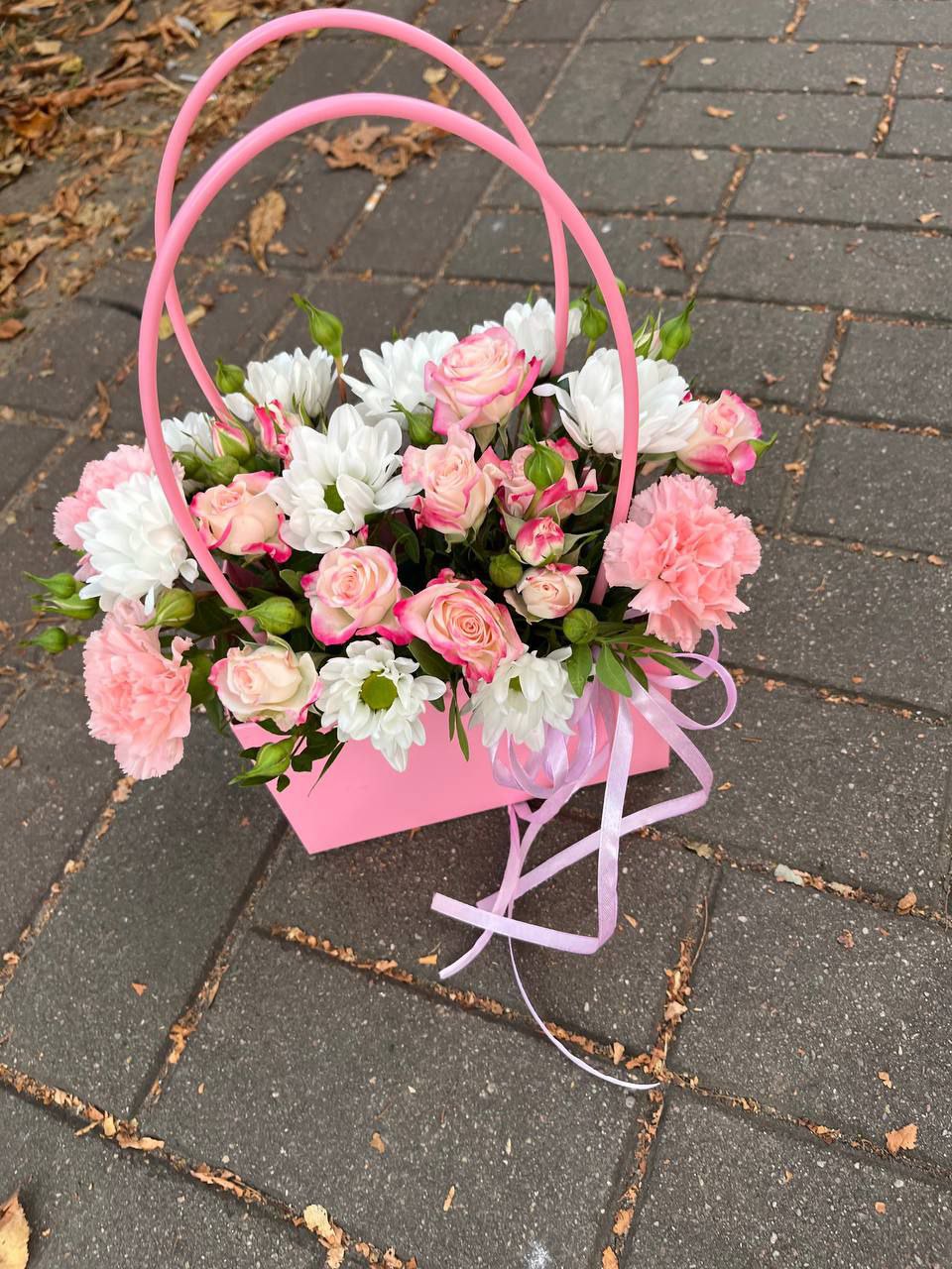 Цветочная композиция в коробке – это вариант подарка для тех, кто привык не только к красоте и благоуханию цветов, но и к удобству. Ей не требуется ваза – внутри сумки находится специальная губка, пропитанная водой, в которую вставлены цветы.