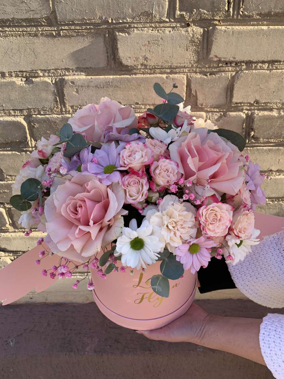 Цветочная композиция в коробке – это вариант подарка для тех, кто привык не только к красоте и благоуханию цветов, но и к удобству. Ей не требуется ваза – внутри сумки находится специальная губка, пропитанная водой, в которую вставлены цветы.